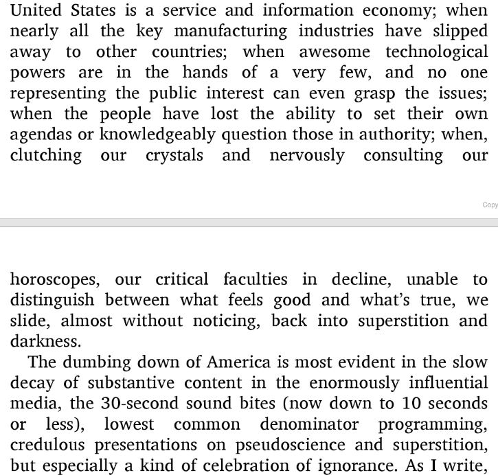 Clicking through the book we find the quote is accurate. More importantly, we find the surrounding context and find that this quote is not being taken out of context. Sagan was truly worried about this issue. His prediction was very much that a sound bite obsessed media, combined with a sort of celebration of ignorance, would drag us backwards. He understood that the world was becoming more difficult while the communication of ideas was simultaneously becoming more shallow.